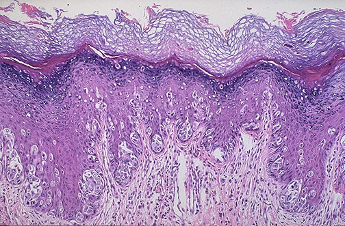 | Paget disease of the breast is shown here. Note the overlying hyperkeratosis of the skin, which helps to produce the rough, red, scaling appearance seen on examination of the skin of the breast, and there is often ulceration. The large cells infiltrating into the epidermis represent intraepithelial extension of an underlying ductal carcinoma in situ or invasive ductal carcinoma. |