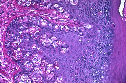 | A PAS stain demonstrates reddish staining mucin within the Paget cells of Paget disease of the breast. This is evidence for their origin from an underlying ductal carcinoma. By immunoperoxidase staining, they will also be keratin positive and epithelial membrane antigen positive. |