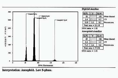 | Cells from the breast obtained by fine needle aspiration (FNA) biopsy or by excisional biopsy can be examined by flow cytometry. The presence of an increased proliferative rate and aneuploidy, as shown in the flow cytometric pattern of this breast carcinoma, suggest a worse prognosis. |