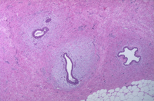 | The normally small amount of male breast tissue consists of just a few ducts, without lobules, in a fibrous stroma. With gynecomastia, this tissue is increased, and there can be ductal epithelial hyperplasia, or prominent periductular edema as seen here. Gynecomastia can be unilateral or bilateral. |