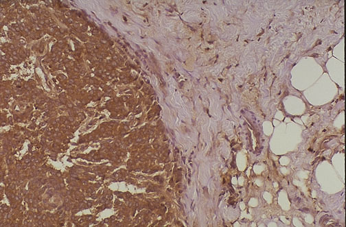 | This is positive immunohistochemical staining for cathepsin D (an acidic lysosomal protease) in a breast carcinoma. Note the cytoplasmic staining of the neoplastic cells on the left, as well as staining in the stroma to the right. There is a correlation between cathepsin D positivity and presence of metastases (particularly lymph nodes). Cathepsin D staining is more likely to be observed in non-ductal carcinomas. |