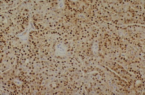 | Here is another example of estrogen receptor (ER) positivity in a breast carcinoma. The use of the immunohistochemiccal technique allows determination of ER positivity within just the nuclei of the neoplastic cells, without interference from other non-neoplastic cells. |