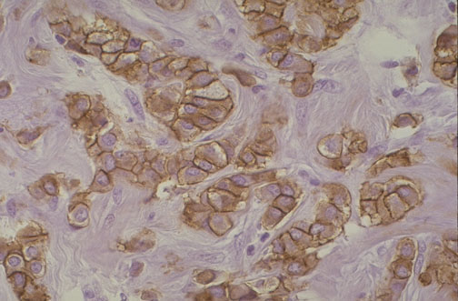 | This is positive immunohistochemical staining for C-erb B-2 (HER-2/neu) in a breast carcinoma. Note the membranous staining of the neoplastic cells with the antibody directed against the HER-2 gene product (normal cells do not make this product). This gene encodes for an epithelial growth factor receptor on the cell membrane that stimulates cellular proliferation. There is a correlation between HER-2 positivity and high nuclear grade and aneuploidy of a breast cancer. The drug trastuzumab is a monoclonal antibody directed against HER-2 positive breast cancer cells. |