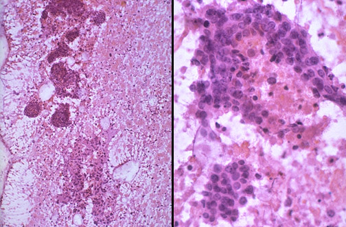 | Fine needle aspiration (FNA) cytology is a useful technique for diagnosis of palpable and mammographically detectable breast lesions. Seen on the left at low magnification are discohesive clusters of cells; on the right at high magnification the atypical nuclei characteristic for a carcinoma are present. |