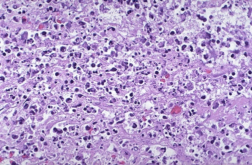 | When there is marked cellular injury, there is cell death. This microscopic appearance of myocardium is a mess because so many cells have died that the tissue is not recognizable. Many nuclei have become pyknotic (shrunken and dark) and have then undergone karorrhexis (fragmentation) and karyolysis (dissolution). The cytoplasm and cell borders are not recognizable. |