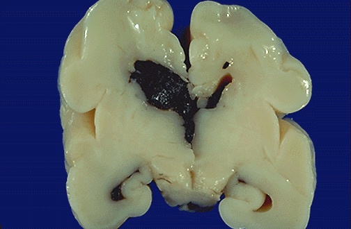 | This is intraventricular hemorrhage (IVH) which arose in the subependymal region (germinal matrix) of a 28 week gestational age newborn. The germinal matrix region is very susceptible to such lesions at this period of development, leading to IVH as a complication of prematurity. |