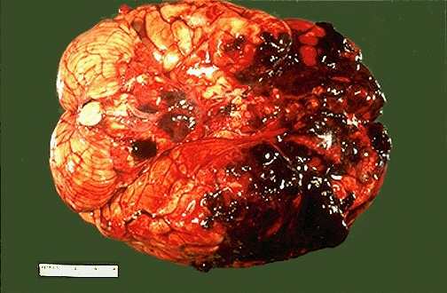 The characteristic location of the hemorrhage in this brain is consistent with a fall backwards resulting in a contracoup injury to the inferior frontal and temporal lobes. This has resulted in extensive contusions and subarachnoid hemorrhage.