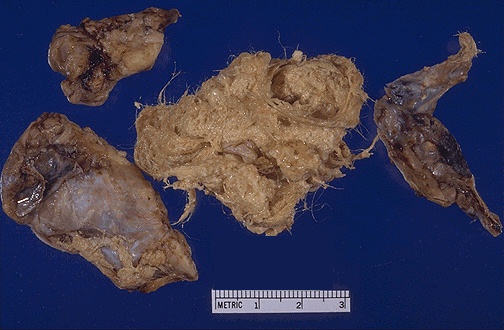 | Germ cell neoplasms can arise in the midline of the body in a variety of locations. One form of such a neoplasm is a "dermoid cyst" which contains two of the germ cell layers (ectodermal and mesodermal) and is slow growing. The hair and sebaceous material seen here came from a dermoid cyst of the cerebellum. |