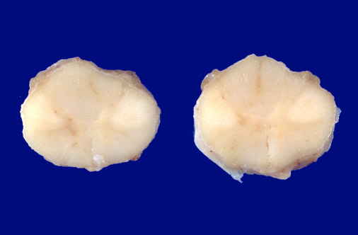 Grossly, the corticospinal tracts in these cross sections of thoracic spinal cord demonstrate a