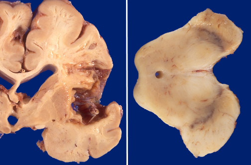 | A remote cerebral infarction is seen here, with a residual cystic space after resolution of the liquefactive necrosis. The resultant Wallerian degeneration has decreased the descending corticospinal tracts, and the cerebral peduncle of the midbrain is reduced unilaterally. |