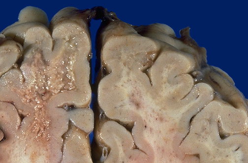 ![]() | Progressive multifocal leukoencephalopathy (PML) is an infection of the CNS caused by the JC papovavirus. PML occurs in immunocompromised patients, such as those with AIDS. PML appears grossly as irregular areas of granularity in white matter, which bear some resemblance to the plaques of demyelination with multiple sclerosis. |