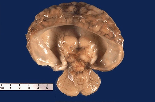 | There is a range of findings, including facial abnormalities, that can occur in association with holoprosencephaly, many of which can be seen in a fetus by ultrasound examination, so that prenatal diagnosis is possible. The large single ventricle seen here inside a single hemisphere represents the "alobar" form of holoprosencephaly in which there was no division of hemispheres. [Image contributed by Jeannette J. Townsend, MD, University of Utah] |