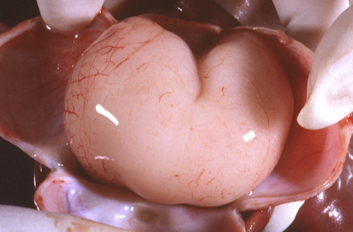 | The skull is opened here to reveal the "semilobar" form of holoprosencephaly, because there is a small cleft representing an attempt to separate the hemispheres. There is no gyral pattern seen here (lissencephaly) because this stillborn fetus was under 20 weeks gestation. Holoprosencephaly is a grave condition with little or no brain function. |
