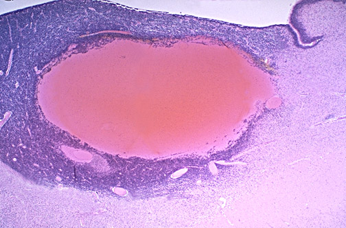 | The microscopic appearance of a germinal matrix hemorrhage is shown here. The germinal matrix is a highly cellular and highly vascular region from which cells migrate out during brain development, mainly between 22 and 30 weeks gestation. This area is highly vulnerable to birth injury and changes in blood pressure following birth. If severe and if survival occurs, the hemorrhage may organize and lead to obstructive hydrocephalus. |