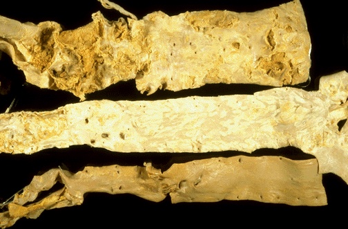 | These three aortas demonstrate mild, moderate, and severe atherosclerosis from bottom to top. At the bottom, the mild atherosclerosis shows only scattered lipid plaques. The aorta in the middle shows many more larger plaques. The severe atherosclerosis in the aorta at the top shows extensive ulceration in the plaques. |