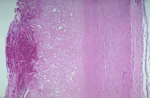 | This microscopic cross section of the aorta shows a large overlying atheroma on the left. Cholesterol clefts are numerous in this atheroma. The lumenal surface on the far left shows ulceration and hemorrhage. Despite such ulceration, atheromatous emboli are rare (or at least, complications of them are rare). |