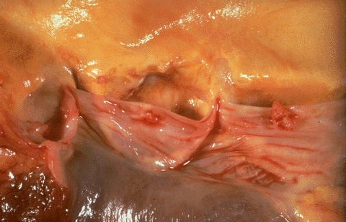 | The small pink vegetation on the rightmost aortic cusp margin represents the typical finding with non-bacterial thrombotic endocarditis (NBTE, or so-called "marantic endocarditis"). This is a non-infective form of endocarditis. It tends to occur in persons with a hypercoagulable state (such as Trousseau syndrome, a paraneoplastic syndrome associated with malignancies) and in very ill persons. |