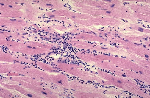 | The interstitial lymphocytic infiltrates shown here within the myocardium are characteristic for a viral myocarditis, which is probably the most common type of myocarditis. Many of these cases are probably subclinical. Some may be a cause for sudden death in young persons. There is usually little necrosis. The most common viral agent is Coxsackie B. |