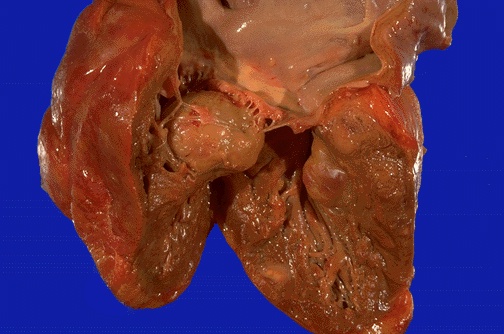 | Just beneath the mitral valve in the left ventricular chamber can be seen a large tumor mass extending from the endocardial surface. A metastatic carcinoma could have this appearance. (Actually, this turned out to be a "chloroma" or a mass of leukemic cells in a patient with myelogenous leukemia). |