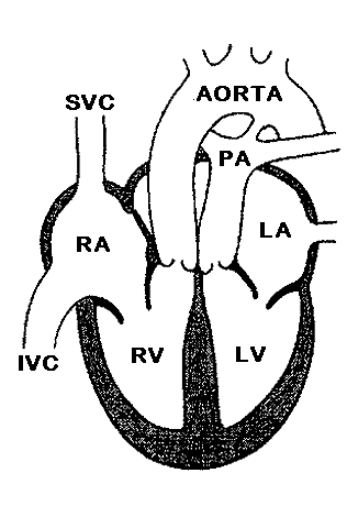 | In the diagram above, transposition of the great vessels is shown. This occurs when the trunco-conal septum does not spiral down. Instead, it descends straight down. As a result, the outflow of right ventricle is into the aorta and the outflow from the left ventricle is into the pulmonic trunk. In order for this system to work, there must be a connection between the system and pulmonic circulations. Sometimes this is through a ventricular septal defect or an atrial septal defect. In the diagram, at the left, it is through a patent ductus arteriosus. |