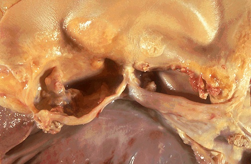 | Here is a congenital bicuspid aortic valve. Most bicuspid valves are prone to calcification over many years. Patients can remain relatively asymptomatic until the aortic stenosis reaches a critical point when congestive heart failure rapidly ensues. The dense white nodules of calcification are present on both of these valve surfaces. The aortic valve here has been opened with the aortic outflow above and the left ventricular myocardium below. |