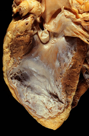 | There has been a previous extensive transmural myocardial infarction involving the free wall of the left ventricle. Note that the thickness of the myocardial wall is normal superiorly, but inferiorly is only a thin fibrous wall. The infarction was so extensive that, after healing, the ventricular wall was replaced by a thin band of collagen, forming an aneurysm. Such an aneurysm represents non-contractile tissue that reduces stroke volume and strains the remaining myocardium. The stasis of blood in the aneurysm predisposes to mural thrombosis. |