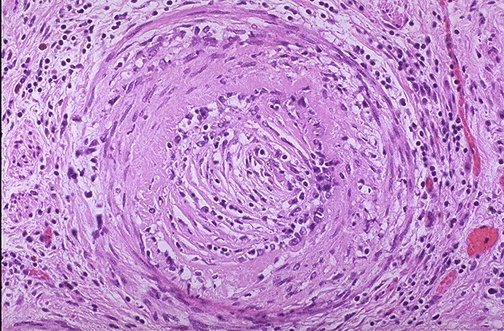| This muscular artery shows features of a vasculitis with chronic inflammatory cell infiltrates. The endothelial cells have proliferated and the lumen is obliterated. Often, vasculitis is a feature of an autoimmune disease, such as systemic lupus erythematosus as was present in this patient. Vasculitis is uncommon, and the various forms are confusing and difficult to diagnosis and classify. Serologicc testing for ANA and ANCA may help diagnosis and distinguish the various forms of vasculitis. |