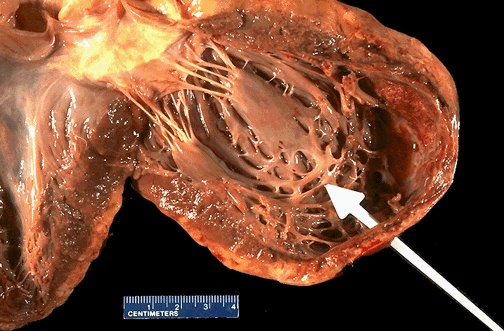 | In cross section, the point of rupture of the myocardium is shown with the arrow through the left ventricular wall. In this case, there was a previous myocardial infarction 3 weeks before, and another myocardial infarction occurred, rupturing through the already thin ventricular wall 3 days later. |