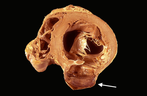 | A cross section through the heart reveals a ventricular aneurysm with a very thin wall at the arrow. Note how the aneurysm bulges out. The vascular stasis in this aneurysm allows formation of the mural thrombus, which is present here within the aneurysm. |