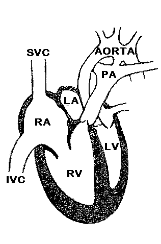 | This diagram depicts a hypoplastic left heart. In this condition, there can be a spectrum of hypoplasia ranging from mild reduction in size of the left ventricle to virtual absence of the left ventricle, with just a microscopic slit for a chamber. The worse the hypoplasia, the worse the prognosis. The mitral and aortic valves show varying degrees of hypoplasia to atresia. The left atrium is also small. The foramen ovale and/or ductus remain patent. |