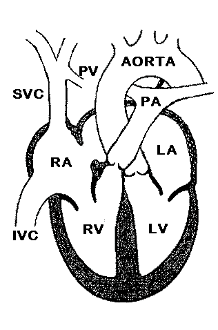 | This diagram depicts a total anomalous pulmonary venous return (TAPVR). In this condition, the pulmonary veins do not return to the left atrium, but connect to the innominate vein, coronary sinus, or some other anomalous site. There is overload of the right heart. In the case shown here, an atrial septal defect provides for flow of oxygenated blood to the left heart. |