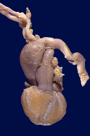 | This fetal heart demonstrates an aortic coarctation of the pre-ductal (infantile) variety. There is aortic outflow obstruction, leading to aortic root dilation. The pulmonic trunk is also visible. This female fetus was found to have a 45, X karyotype, consistent with Turner's syndrome. Congenital anomalies often include the heart. |