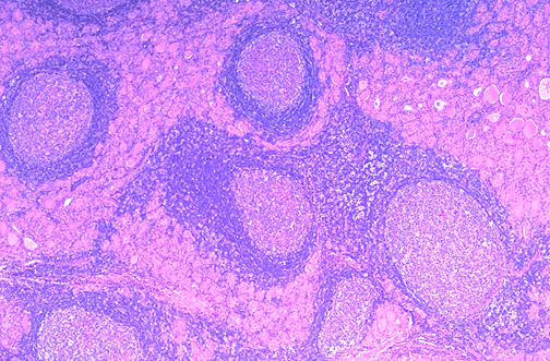 | This low power microscopic view of a thyroid with an early stage of Hashimoto thyroiditis shows prominent lymphoid follicles. This is an autoimmune disease, and often antithyroglobulin and antimicrosomal (thyroid peroxidase) antibodies can be detected in serum. Other autoimmune diseases such as Addison disease or pernicious anemia may also be present. Both thyroid growth immunoglobulins (TGI) and thyroid stimulating immunoglobulins (TSI) are present, though blocking antibodies to TSI mitigate their effect. |