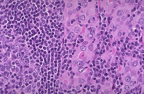 | This high power microscopic view of thyroid with Hashimoto thyroiditis demonstrates the pink Hürthle cells at the center and right. A lymphoid follicle is at the left. Hashimoto thyroiditis initially leads to painless enlargement of the thyroid, followed by progressive atrophy over following years. Aside from surgery, this is the most common cause for hypothyroidism in adults. |