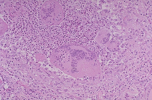 | This is subacute granulomatous thyroiditis (DeQuervain disease), which probably follows a viral infection and leads to a painful enlarged thyroid. This disease is usually self-limited over weeks to months, with transient hyperthyroidism and/or hypothyroidism, and affected patients return to a euthyroid state. Note the presence of large foreign body giant cells with inflammatory destruction of thyroid follicles. |