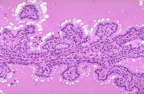 | Shown at high power, the tall columnar thyroid epithelium with Graves disease lines the hyperplastic infoldings into the colloid. Note the clear vacuoles in the colloid next to the epithelium where the increased activity of the epithelium to produce increased thyroid hormone has led to scalloping out of the colloid in the follicle. |