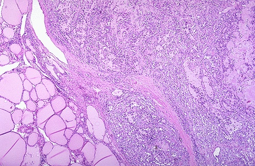 | At the center and to the right is a medullary carcinoma of thyroid. At the far right is pink hyaline material with the appearance of amyloid. These neoplasms are derived from the thyroid "C" cells and, therefore, can have neuroendocrine features such as secretion of calcitonin or other hormones. |