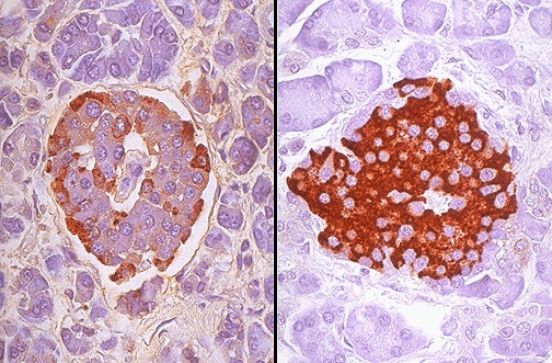 | Immunohistochemiccal staining can help identify the nature of endocrine function of the cells present in the islets of Langerhans. On the right, antibody to insulin has been employed to identify the beta cells. On the left, antibody to glucagon identifies the alpha cells. |