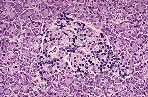| This is an insulitis of an islet of Langerhans in a patient who will eventually develop type I diabetes mellitus. The presence of the lymphocytic infiltrates in this edematous islet suggests an autoimmune mechanism for this process. The destruction of the islets leads to an absolute lack of insulin that characterizes type I diabetes mellitus. |