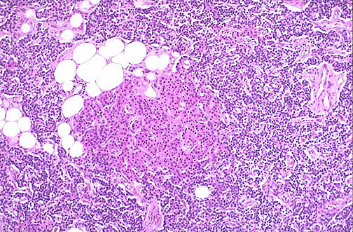 ![]() | In parathyroid hyperplasia, there is little or no adipose tissue, but any or all cell types normally found in a parathyroid gland are present. Note the pink oxyphil cells in the nodule seen here. This is actually "secondary hyperparathyroidism" with enlarged glands as a consequence of chronic renal failure with impaired phosphate excretion. The increased serum phosphate tends to drive serum calcium down, which in turn drives the parathyroids to secrete more parathormone. |