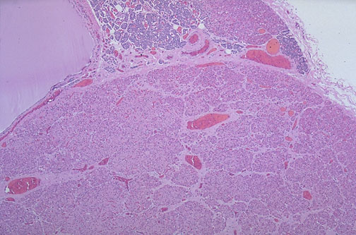 ![]() | Adjacent to this parathyroid adenoma is a rim of normal parathyroid (with a pink oxyphil cell nodule) at the upper right, and a small benign parathyroid cyst (an incidental finding) is at the upper left. Patients with this form of primary hyperparathyroidism are usually diagnosed with routine chemistry panels in which a high serum calcium is noted, though some may present with renal stones, bone pain, headaches, gallstones, pancreatitis, or gastric ulcers. A parathormone (PTH) assay reveals a high normal to elevated level of PTH. |
