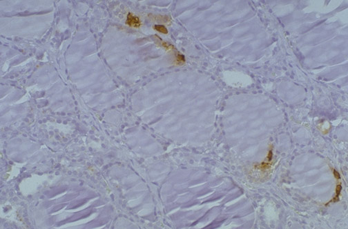 | This immunohistochemical stain with antibody to calcitonin identifies the "C" cells (parafollicular cells) of the thyroid interstitium between the follicles, or adjacent to the epithelium of follicles. These parafollicular cells secrete calcitonin, which has minimal impact upon calcium regulation. |