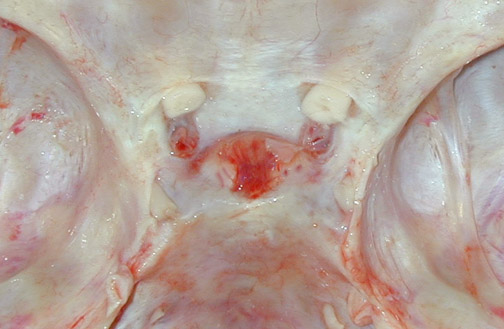 | The anterior pituitary may double in size during pregnancy. Seen here is a pituitary completely filling and bulging from the sella in a patient who succumbed to a peripartum hemorrhage. Such a physiologically enlarged pituitary is at risk for ischemic necrosis in such an event because the venous portal system is unable to supply sufficient blood flow to the adenohypophysis. Postpartum pituitary necrosis is known as Sheehan syndrome. |
