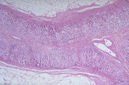 | The most common cause for Addison disease (which is rare) in developed nations is an idiopathic (probably autoimmune) disease leading to atrophy, as seen here. Note that here at low power most of the adrenal is visible. The medulla is not affected. Other autoimmune conditions may also be present, including Graves disease, Hashimoto thyroiditis, and diabetes mellitus. Patients may have weakness, nausea, vomiting, hypotension, skin pigmentation, and weight loss. Laboratory findings include hyponatremia, hypoglycemia, and hyperkalemia. |