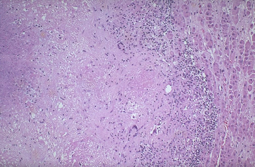 | Years ago, and still today in places with a high incidence of active tuberculosis with dissemination from the lungs, the most common cause for Addison disease is granulomatous inflammation and adrenal cortical destruction. Infections such as histoplasmosis can produce similar findings. Note the caseous necrosis, the Langhans giant cells, and the residual cortex seen here. |