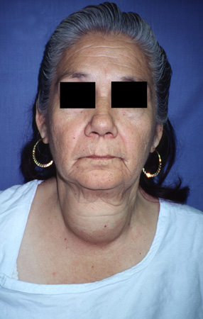 as a consequence of a goiter of the thyroid gland. She is euthyroid, but is bothered by the enlarged thyroid, which presents a cosmetic problem as well as some discomfort.