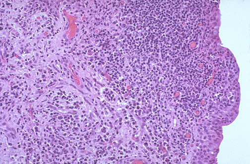 | This is the microscopic appearance of a chalazion of the eyelid. Note the intense chronic inflammation. Release of lipid from the Meibomian glands can result in a foreign body granulomatous inflammatory response. Thus, epithelioid macrophages as well as giant cells can be present. |