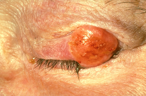 | Here is a squamous cell carcinoma of the upper eyelid. This mass lesion is a neoplasm arising from sun damaged squamous epithelium. It arises out of actinic keratosis proceeding to carcinoma in situ proceeding to invasive carcinoma. Removal presents the same problems as with a basal cell carcinoma. [Image contributed by Nick Mamalis, MD, University of Utah] |