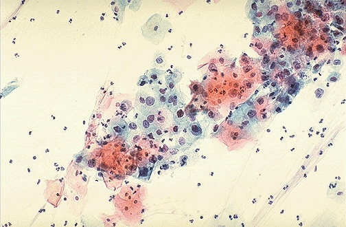This is a Pap smear. The cytologic features of normal squamous epithelial cells can be seen at the center top and bottom, with orange to pale blue plate-like squamous cells that have small pyknotic nuclei. The dysplastic cells in the center extending to upper right are smaller overall with darker, more irregular nuclei. Most squamous epithelial dysplasias and carcinomas are driven by human papillomavirus infection (HPV). In most cases HPV infections are cleared in 8 to 14 months in young, healthy women. However, there can be repeated infection. The HPV E7 protein binds to the hypophosphorylated form of RB, a tumor suppressor gene, which then no longer acts as a cell-cycle inhibitor. The binding is particularly strong for viral subtypes such as HPV 16 and 18, increasing the risk for progression to higher grade dysplasia or carcinoma. Testing for these high-risk subtypes can be carried out. |