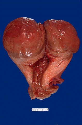 ![]() | Here is a very large leiomyoma of the uterus that has undergone degenerative change and is red (so-called "red degeneration"). Such an appearance might make you think that it could be malignant. Remember that malignant tumors do not generally arise from benign tumors, which is a good thing, because leiomyomas are so common (at least 20% of women will have one). Postmenopausally, leiomyomas tend to regress in size and become fibrotic. |
